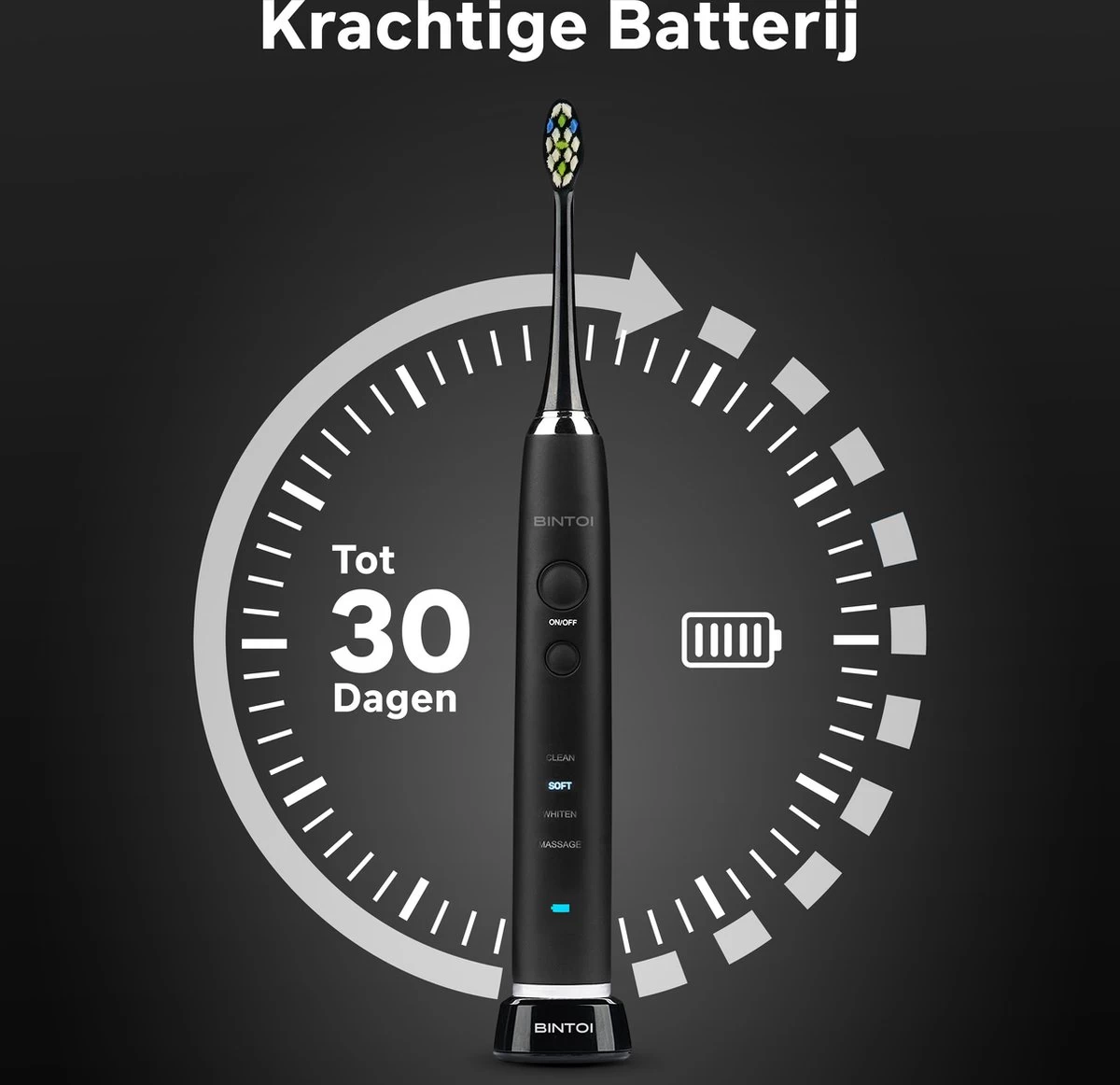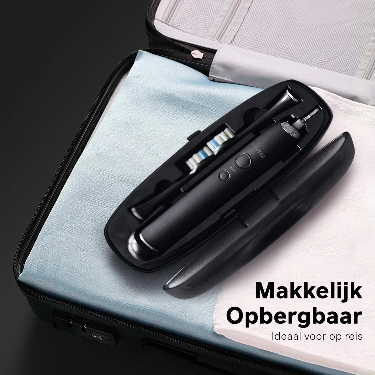40.000 VPM Slimme tandenborstel – schoonheid, hersens en kracht. De Black-serie is een moderne elektrische tandenborstel van wereldklasse, boordevol met de modernste technologie. Hij beschikt over een ultra-krachtige en toonaangevende motor die 40000 trillingen per minuut produceert, een lithium-ion batterij, supersnel draadloos opladen, 4 standen, slimme vibratietimers, 8 door DuPont ontworpen borstelkoppen en borstelharen, en een op maat gemaakte reisetui; dit alles met een slank, lichtgewicht en IPX7 waterproof ontwerp.