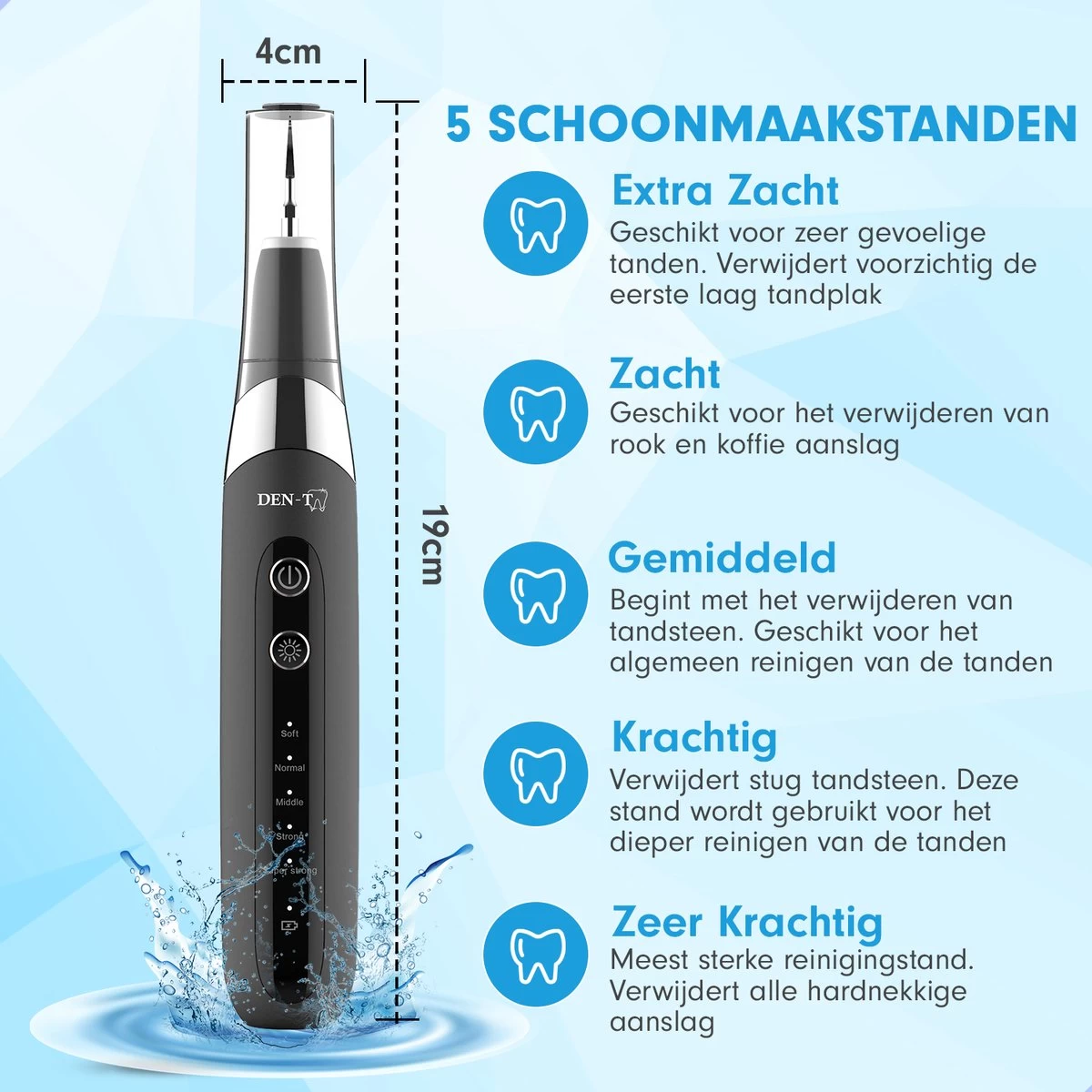 Wacht niet tot je wordt doorgestuurd naar de mondhygiëniste. Verzorg je tanden maandelijks zelf thuis! Last van tandplak en tandsteen of wil jij gewoon graag je gebit goed verzorgen? Ben je op zoek naar dat mondhygiënisteschone gevoel dat je elektrische tandenborstel je belooft, maar niet geeft? Dan is DEN-T® de oplossing voor jou! Dankzij deze professionele sonische tandsteenverwijderaar zorg je zelf voor een gezonde glimlach.
