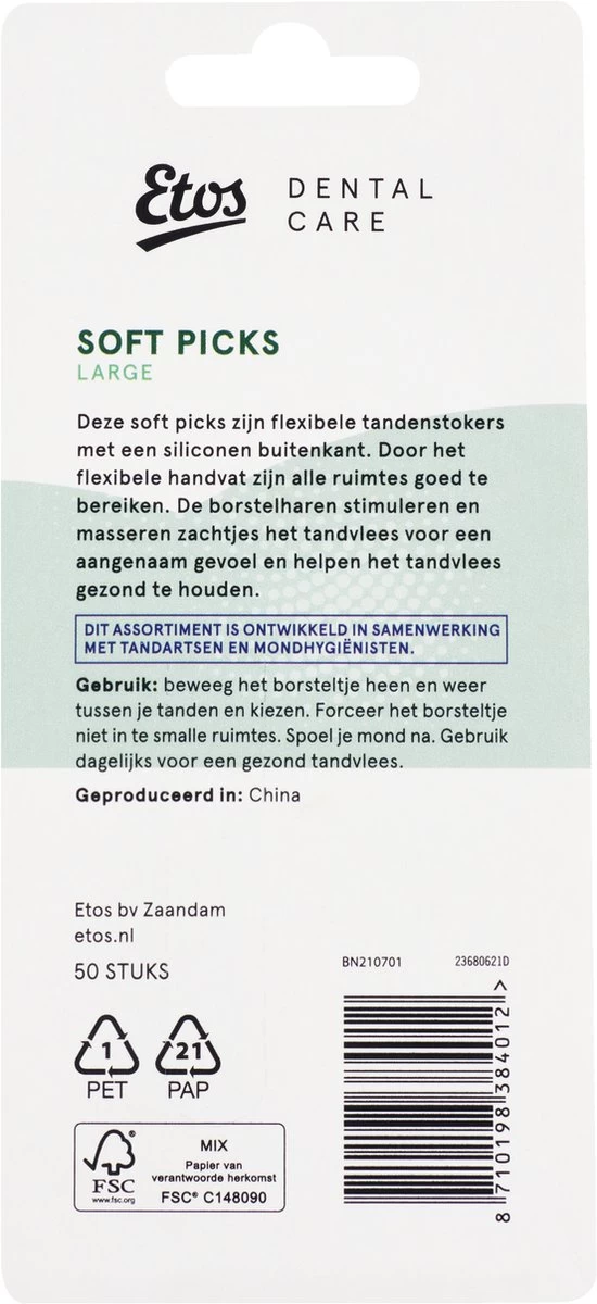 Etos soft picks L zijn flexibele tandenstokers met een siliconen buitenkant. Door het flexibele handvat zijn alle ruimtes goed te bereiken.