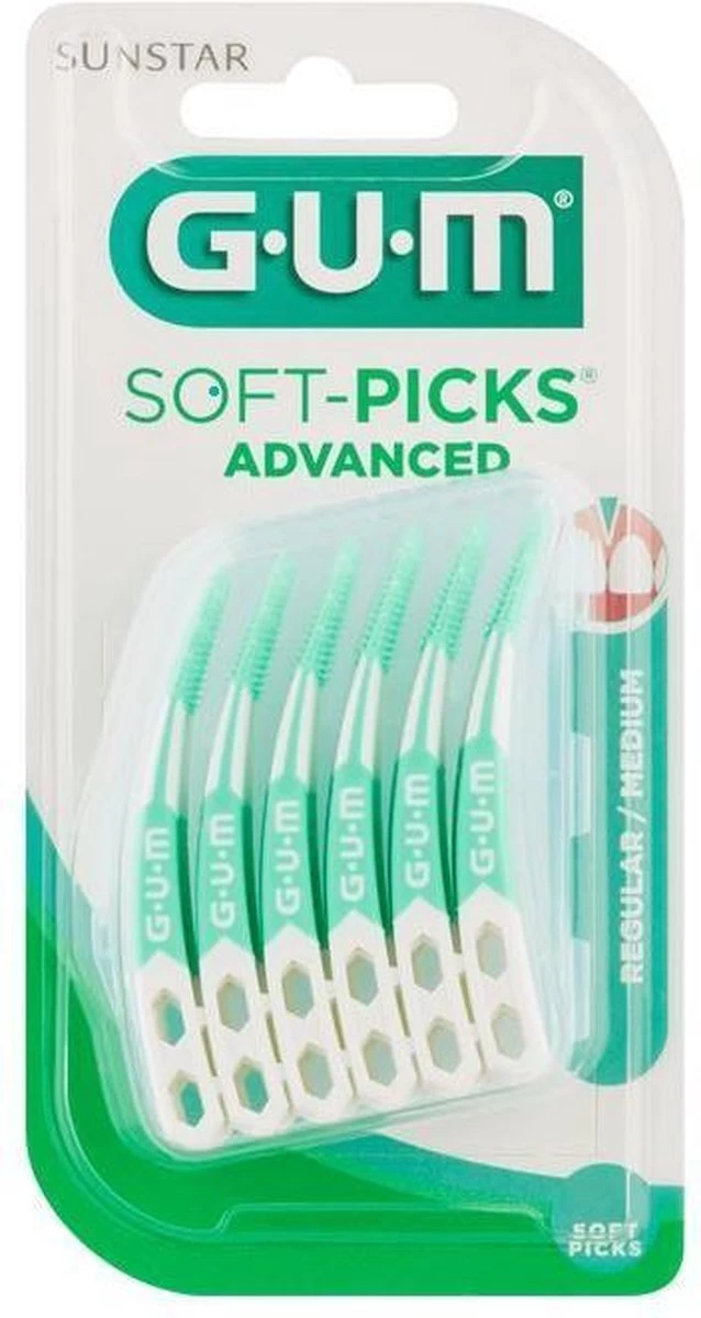 De licht gebogen Soft-Picks Advanced zorgen voor een makkelijke toegang tussen de achterste kiezen. De Soft-Picks Advanced Regular van GUM bevatten een laagje fluoride om uw tanden optimaal te verzorgen. Ze zorgen voor gezond tandvlees en een betere doorbloeding.