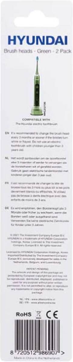 Deze Hyundai opzetborstels zijn geschikt voor de onderstaande elektrische tandenborstels van Hyundai. Het wordt aanbevolen om de opzetborstel elke drie maanden of eerder te vervangen als de borstelharen wit of gerafeld worden. Deze opzet borstels zijn geschikt voor de onderstaande tandenborstels van Hyundai: