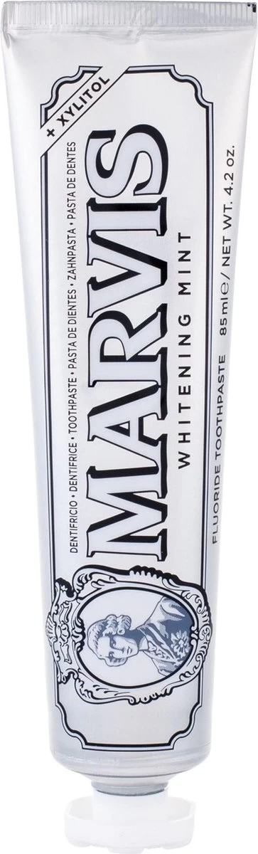De Whitening Mint tandpasta van Marvis bevat speciale ingredinten die vlekken en verkleuringen verwijdert, dat voor een mooie en prachtige glimlach zorgt. De tandpasta heeft een scherpe muntsmaak voor een aangename en blijvende frisheid.