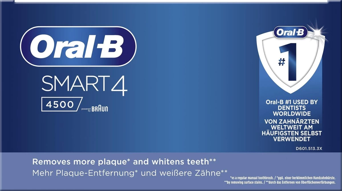 De Oral-B Smart 4 4500 heeft een geavanceerde Lithium Ion-batterij die meer dan twee weken meegaat. Zo hoef je niet na te denken over je oplader tijdens je vakantie.