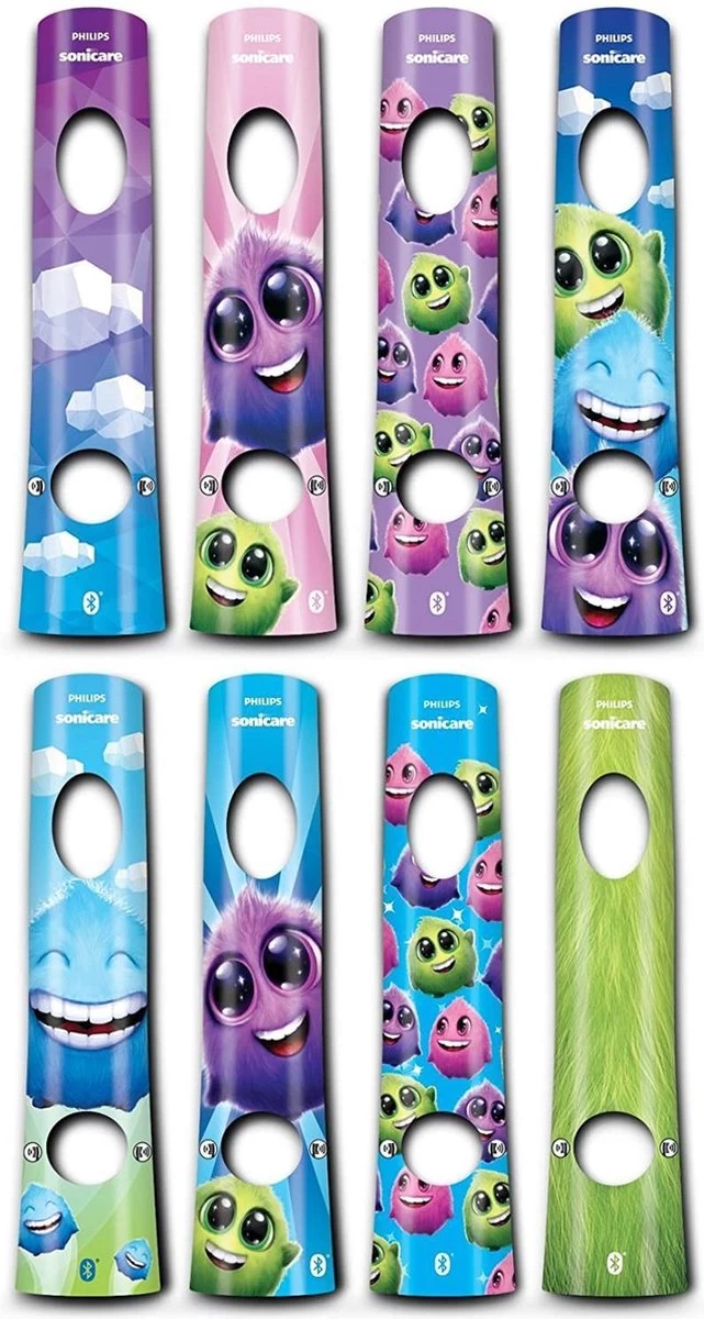 Met de leuke handvatstickers kunnen kinderen hun tandenborstel een eigen look geven. Met de acht verwisselbare ontwerpen in elke verpakking van de sonische tandenborstel, kunnen kinderen hun tandenborstel zo vaak als ze willen een nieuwe look geven. In combinatie met de mogelijkheid om het uiterlijk van de hoofdrolspeler uit de app aan te passen, draait de Philips Sonicare For Kidservaring volledig om leuke en daarmee effectieve mondverzorging.