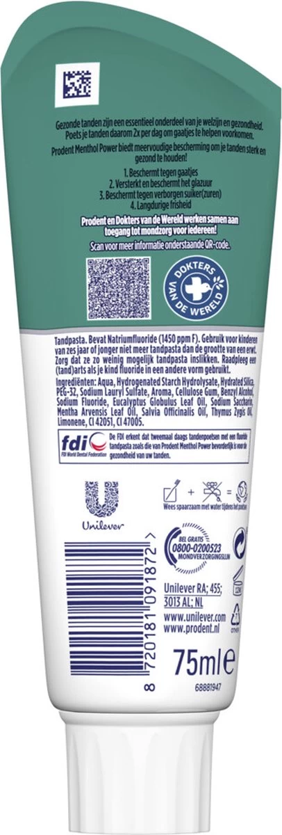 Prodent Menthol Power tandpasta bevat munt en eucalyptus voor een extra frisse adem. Prodent tandpasta biedt bovendien meervoudige bescherming om je tanden sterk en gezond te houden. Het beschermt je tanden tegen gaatjes en verborgen suiker(zuren), versterkt het tandglazuur en zorgt voor langdurige frisheid. Gezonde tanden zijn essentieel onderdeel van je welzijn en gezondheid. Poets je tanden daarom 2x per dag met Prodent Menthol Power tandpasta om gaatjes te helpen voorkomen.