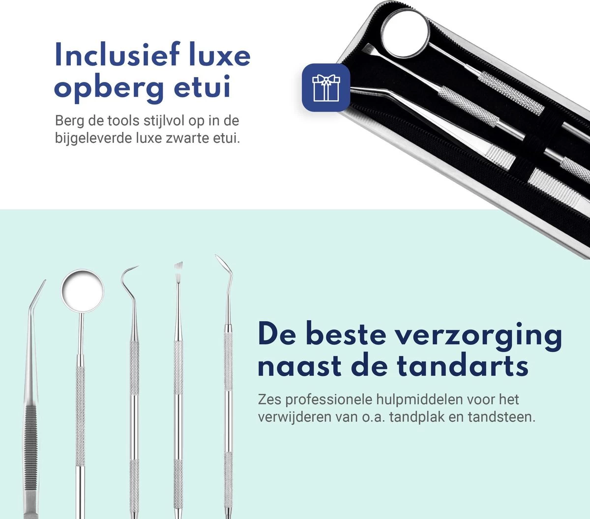 Het complete tandarts setje voor optimale verzorging van uw tanden. Geef uw tanden wat extra aandacht om de tandplak, tandsteen en de aanslag te verwijderen of te voorkomen. Al de gereedschappen van deze tandverzorging set zijn van chirurgisch, roestvrij staal. Dit zorgt ervoor dat het gereedschap niet roest en jij altijd de gereedschappen veilig in je mond kan gebruiken.