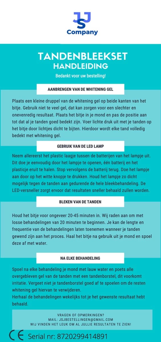 Deze tanden bleekset is makkelijk in gebruik en volledig goedgekeurd aan de hand van de strenge Europese wetgeving. Het betekend dat deze teeth whitening kit geen peroxide bevat waardoor het niet schadelijk is voor je tanden. De tandbleekset is dus compleet onschadelijk voor je tanden, tandvlees en je gehele mondhygiëne. Je tanden bleken is nog nooit zo makkelijk geweest. Geen tandarts of dure facings. Vanaf nu kun je gewoon vanuit thuis je tanden bleken.