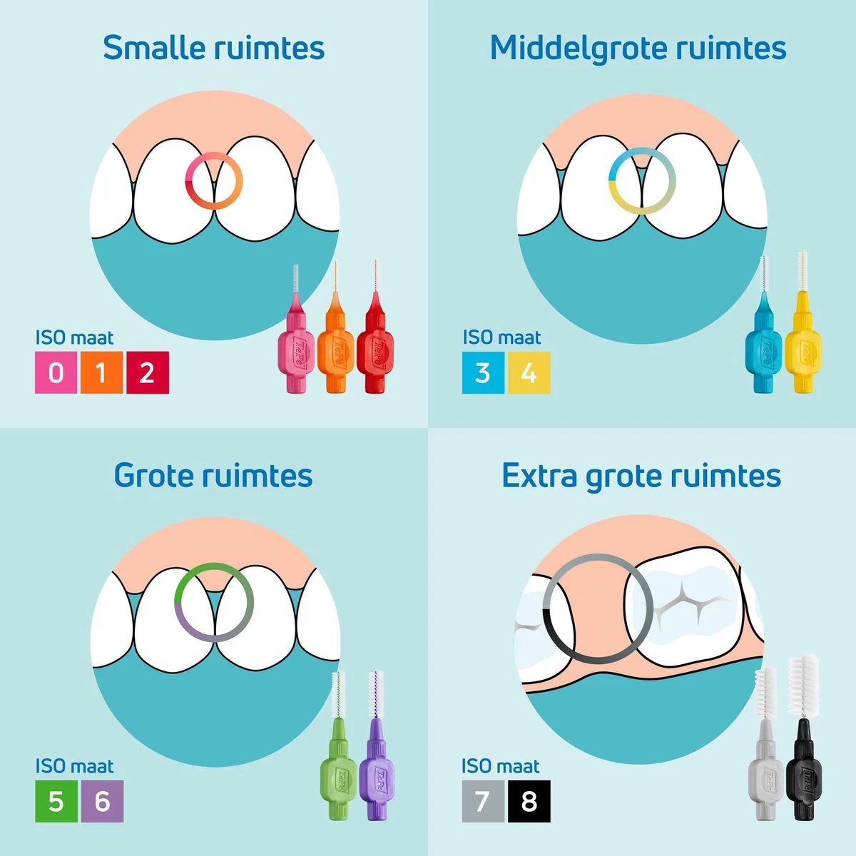 De ragers zijn beschikbaar van onze kleinste maat 0,4 mm (roze) tot 1,5 mm (zwart). Je hebt vaak meer dan 茅茅n borstelmaat nodig. Je tandarts of mondhygi毛nist kan je helpen bij het kiezen van de juiste borstelmaat of -maten. Als je niet naar de tandarts of mondhygi毛nist kunt gaan onthoud dan dat een rager goed moet passen, maar nooit tussen de tanden moet worden geforceerd. Een kleine tip is om te beginnen met de kleinste maat; roze waarna je steeds een grotere maat kunt pakken totdat je de borstel tegen je tand en tandvlees voelt drukken.
