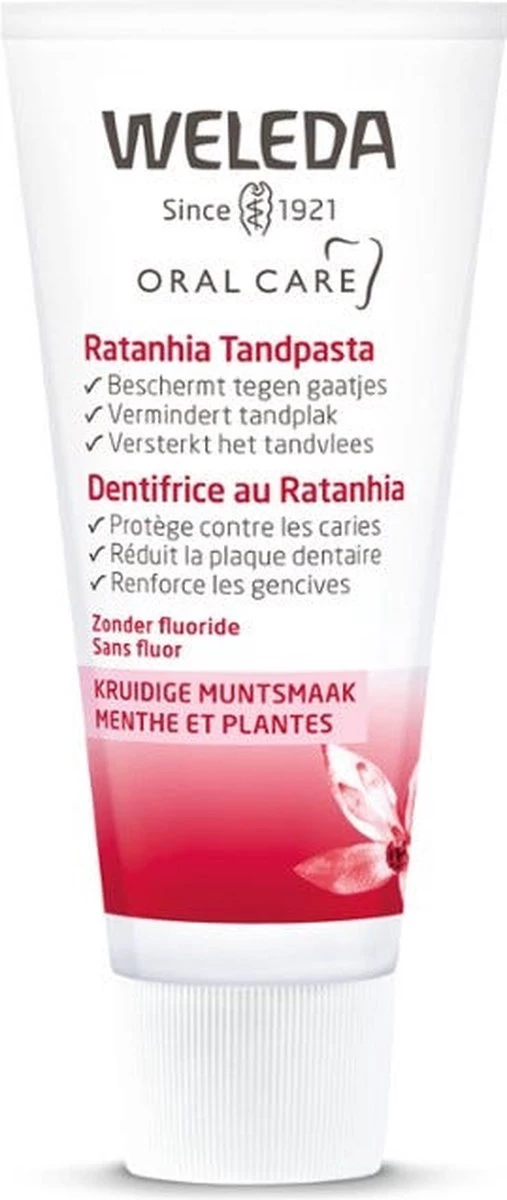 Ratanhia Tandpasta maakt het tandvlees sterk en stevig en trekt het samen rond de tandwortel. Bij goed poetsen met Ratanhia Tandpasta krijgt tandplak geen kans. Als het tandvlees rood en gevoelig is, werken Ratanhia en mirre zuiverend. Aan de tandpasta zijn geen fluoride en synthetische schuimmiddelen toegevoegd. Let op: Dit product bevat pepermuntolie. Om deze reden raden wij af om dit product te gebruiken in combinatie met homeopathische middelen.